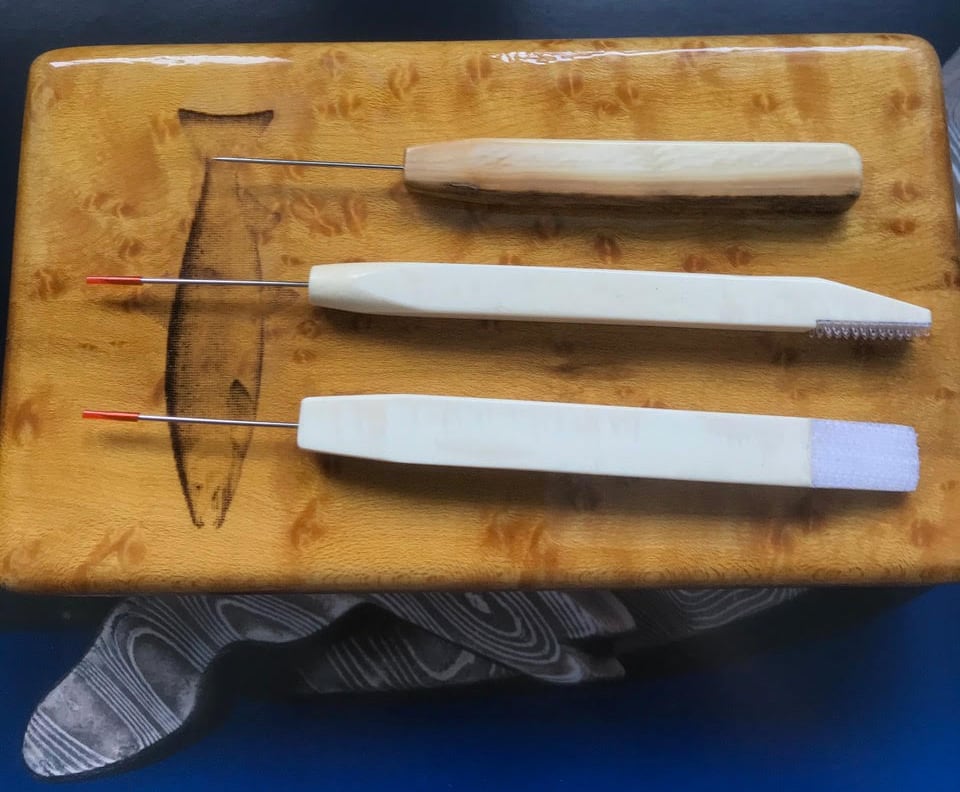 Bodkins are made of select mammoth ivory. Ivory is one of the best materials for burnishing silk and floss wrapping and these bodkins have a smooth edge for that purpose. A velcro patch is also included with which to tease out fibres for that buggy look