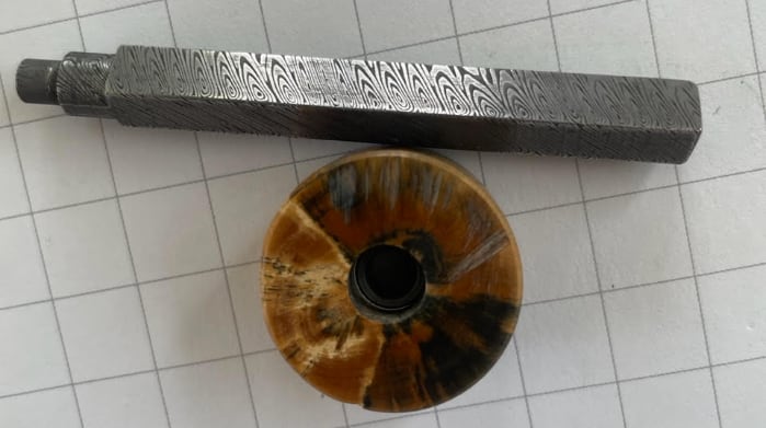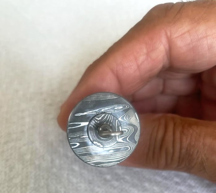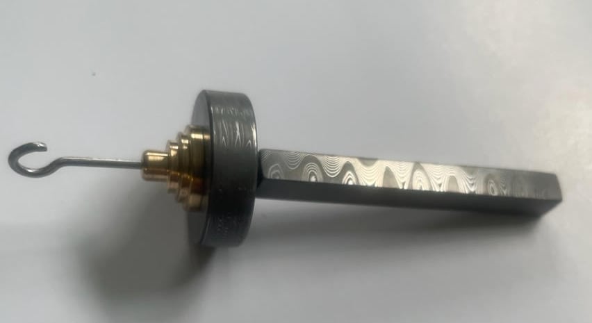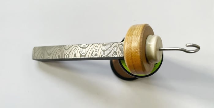 Turbo dubbing twisters are hand made either from rare mammoth ivory (see first photo below) with damascus and bronze, or entirely from damascus. The rectangular cross sectional handle is stable and discourages rolling when hanging against the bobbin rest bar. When hanging, the weight of the Damascus steel holds dubbing tightly; a desirable property those who tie dubbing loops will appreciate