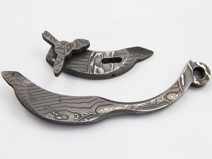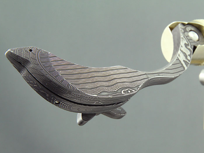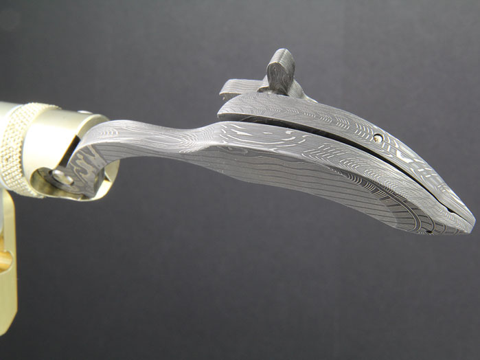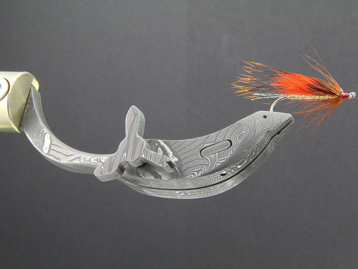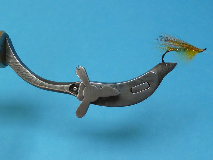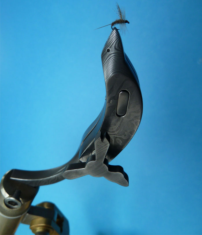 The second Seal vise was fashioned from Damascus stainless steel forged in Sweden. I christened it the "DamaSeal", a play on the metal origin of the vise, and after those damn seals that stole my hooked salmon during my time fishing in BC. It possesses a trillium star wheel, the three spokes of which represent the wings of a may fly, caddis fly