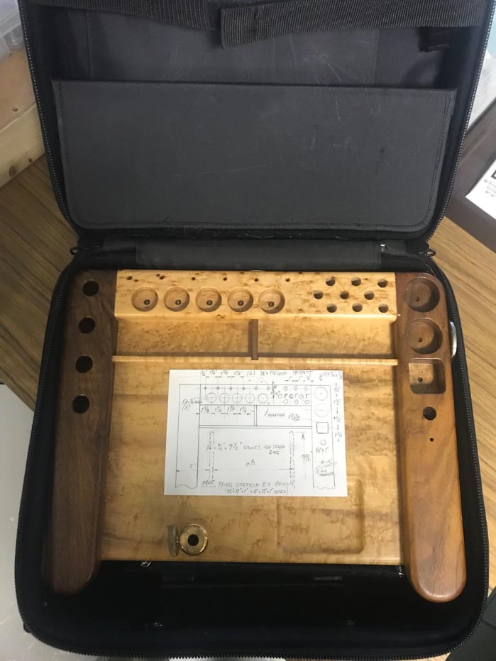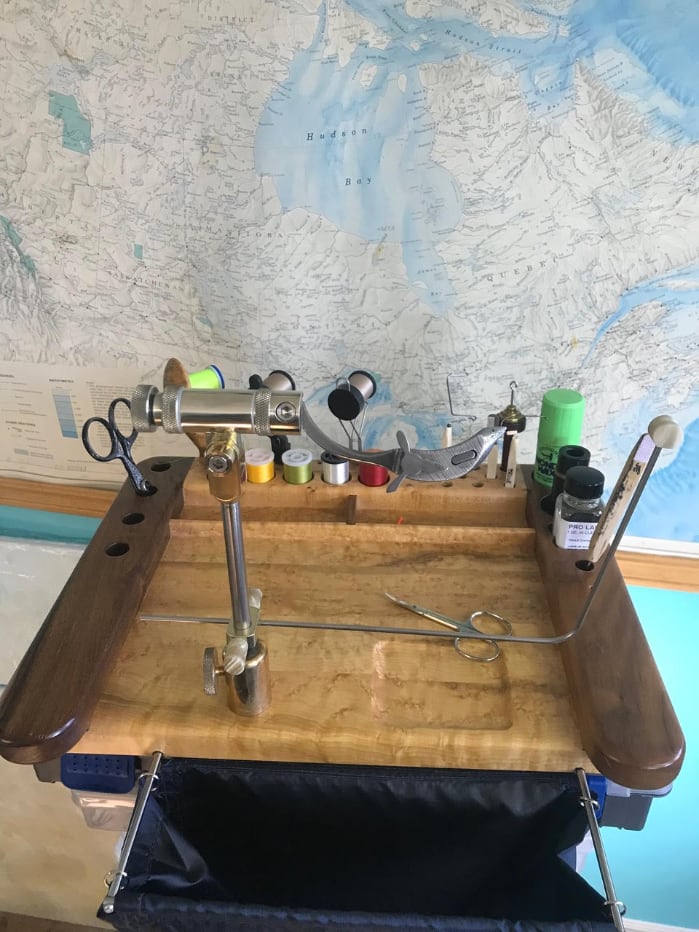 These tying stations provide a practical, portable and stable vise base and feature a pullout trash bag, as well as a square pocket for head cement, which enables single handed opening and closing. The well positioned tool stations leave the immediate vise area clean and accessible. These tying stations are made out of select Canadian birds eye maple and walnut sourced in Quebec, Canada.